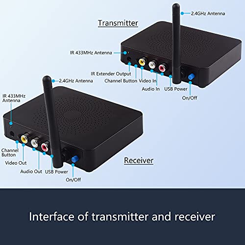 Moretop - Trasmettitore e ricevitore audio wireless 2,4 GHz 8 canali RCA 480P mittente con estensione remota IR per cavo streaming, satellite, DVD a TV senza fili (MT-RCA20)