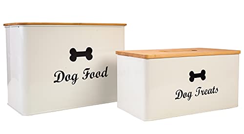 Morezi - Set di contenitori per alimenti per cani, in acciaio al carbonio verniciato a polvere, con guarnizione in gomma, coperchio in legno, per conservare alimenti, colore: Bianco