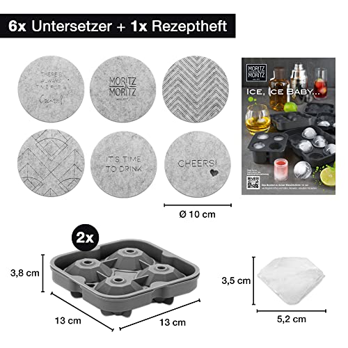 SET COMPLETO - Moritz & Moritz stampo in silicone per cubetti di ghiaccio a forma di diamante, set di 2 stampi per cubetti di ghiaccio a forma di diamante 13 x 13 cm per 8 diamanti di ghiaccio ognuno 13x13cm, libretto con ricette e consigli e 6 sottobicchieri in feltro inclusi
