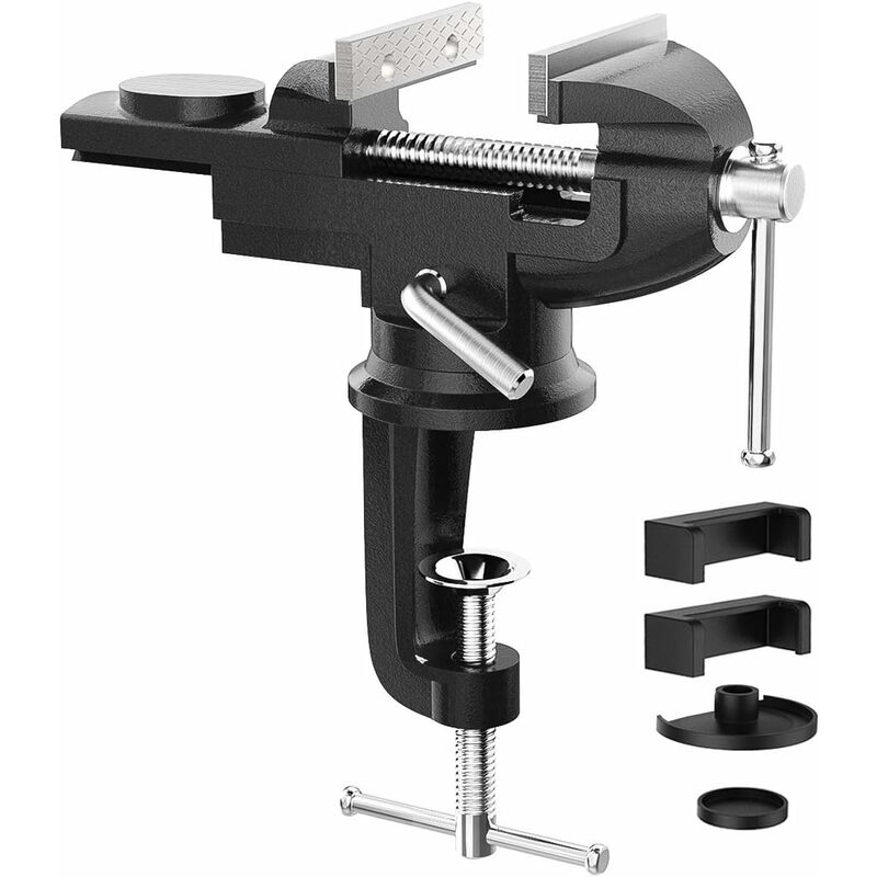 MORSA DA TAVOLO UVERSALE: l'apertura massima della ganascia è fino a 3 pollici / 77,5 mm, larghezza della ganascia 2,75 pollici / 70 mm, questo morsetto da banco si adatta alla maggior parte dei banchi da lavoro e tipi di tavoli con spessore di 0,2 pollici ganasce ispessite / 5 mm per una presa superiore. FUSIONE DI ALTA QUALITÀ: Realizzata in acciaio fuso di alta qualità e perno e dadi cromati, questa morsa da banco offre una lunga durata e una presa robusta. Nota: la forza di serraggio delle ganasce è di 300 kg. Non è sconsigliato per aumentare la leva, come allungare la lunghezza della leva dell'asta della vite ed esercitare una pressione eccessiva sull'asta della vite, altrimenti è facile rompere le ganasce. BASE GIREVOLE A 360 GRADI: La capacità della gola è fino a 2,4 pollici / 61 mm. Base girevole a 360 gradi, perfetta per un'ampia gamma di angoli di bloccaggio. Anche se sei mancino, puoi ruotare la morsa nel posizione adatta al tuo lavoro. AMPIE APPLICAZIONI: queste pinze sono