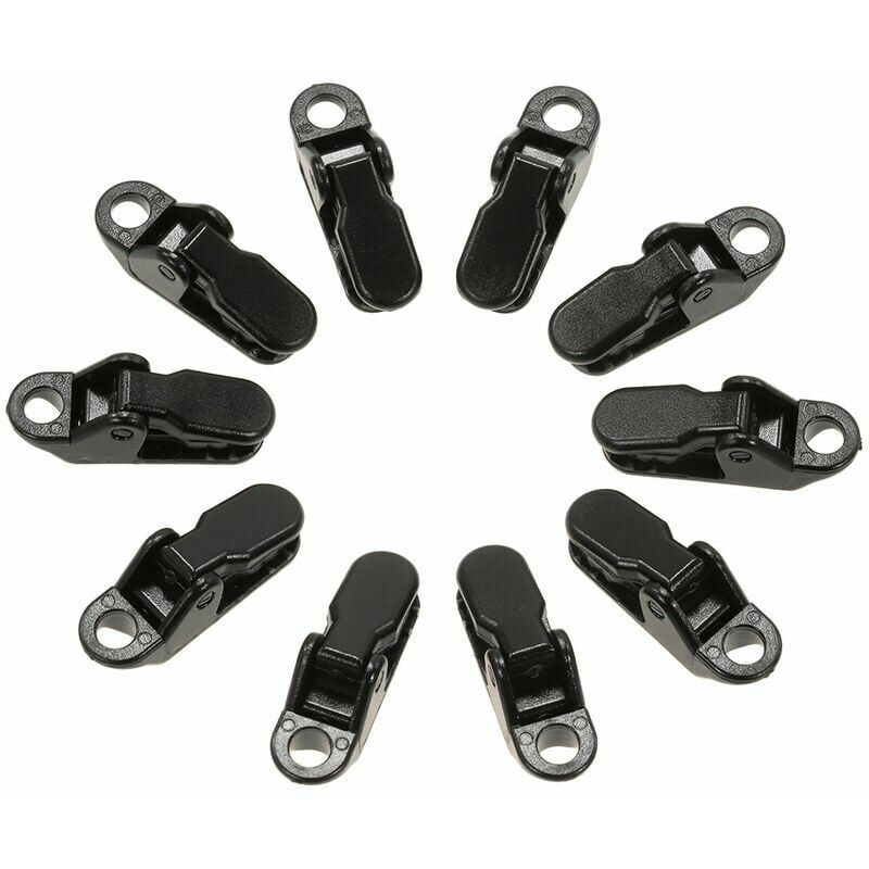 Caratteristiche: Materiale plastico nero resistente. Fornisce un'ulteriore opzione di legatura fissando i morsetti ai bordi del telo. La bocca appositamente alligatore con il dente rende l'occlusione dentale molto più stabile. Pratico schienale per mini gadget, può fissare il baldacchino e rinforzare le tende con la corda dell'ombrello regolamentare militare. Specifica: Materiale: plastica Colore nero Quantità: 10
