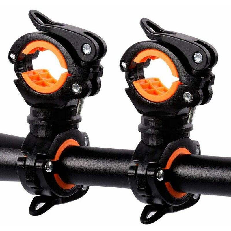 Supporto per torcia girevole a 360°, angolo regolabile. Installa e rimuovi facilmente la torcia dal manubrio della bicicletta. Diametro del morsetto: 18 mm (min) ~ 38 mm (max ). Non solo per la torcia, ma anche per la pompa della bicicletta e altri oggetti personali adatti. Nota: solo 2 morsetti nella confezione, la torcia e la bici non lo sono incluso.