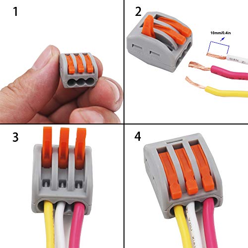 ★ Facile da usare: non sono necessari strumenti, plug and play, riduce notevolmente il tempo di lavoro del cablaggio. Ogni terminale di connessione può anche essere riciclato. Ci sono fori di prova su ogni superficie del connettore, il test elettrico può essere completato senza rimuovere il nastro, intuitivo e facile. Suggerimento: in ogni terminale è possibile inserire un solo cavo dello stesso tipo.