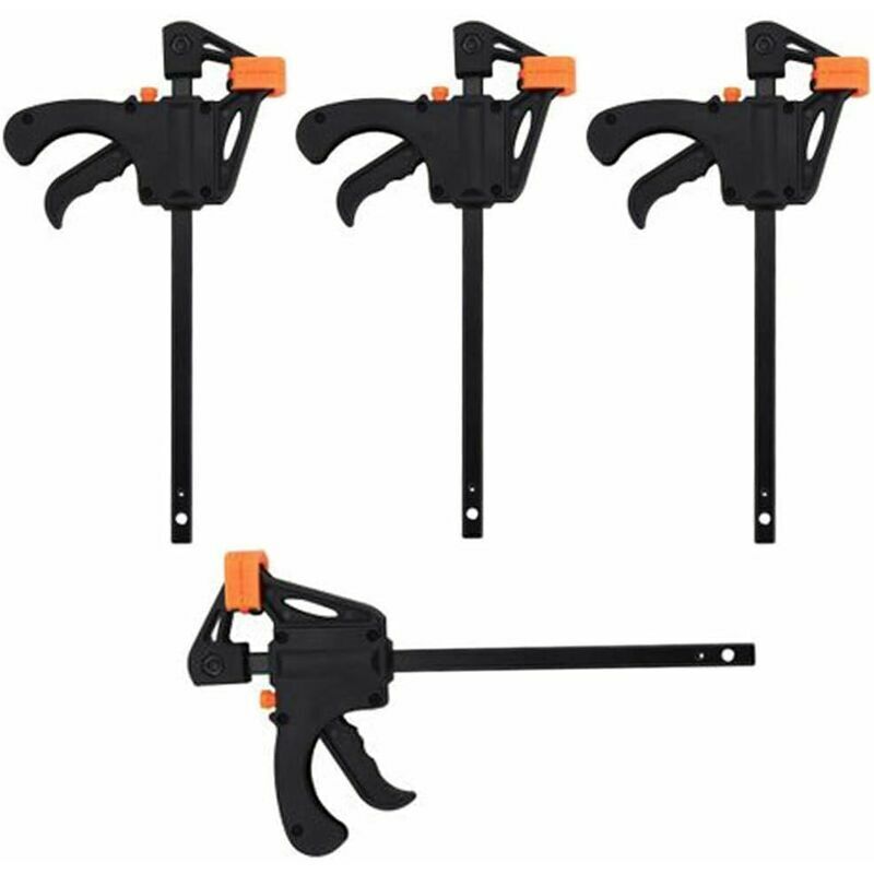 Materiale: realizzato in plastica e lega di alluminio, robusto e durevole. di 4 per soddisfare le esigenze professionali. Il design del grilletto offre un semplice funzionamento con una sola mano, braccio scorrevole e mantiene il legno in posizione. Ampiamente usato nella produzione di mobili e nell'industria dell'imballaggio. ecc. Descrizione del prodotto Caratteristiche: Questo set di morsetti a F blocca i pezzi in modo rapido e preciso per rendere la lavorazione del legno più semplice e comoda. I morsetti per la lavorazione del legno a sgancio rapido con ganasce in plastica non deformano né graffiano il pezzo e l'impugnatura ha un grilletto a pressione che può facilmente bloccare il morsetto.Le ganasce facili da invertire convertono il morsetto in un morsetto di diffusione o un disegno di utensili, facilitano le parti e più efficiente Tuta per la lavorazione del legno e una varietà di piccole pr artigianato. Specifiche: colore principale: nero Lunghezza: 20 cm/4 pollici Dimensione