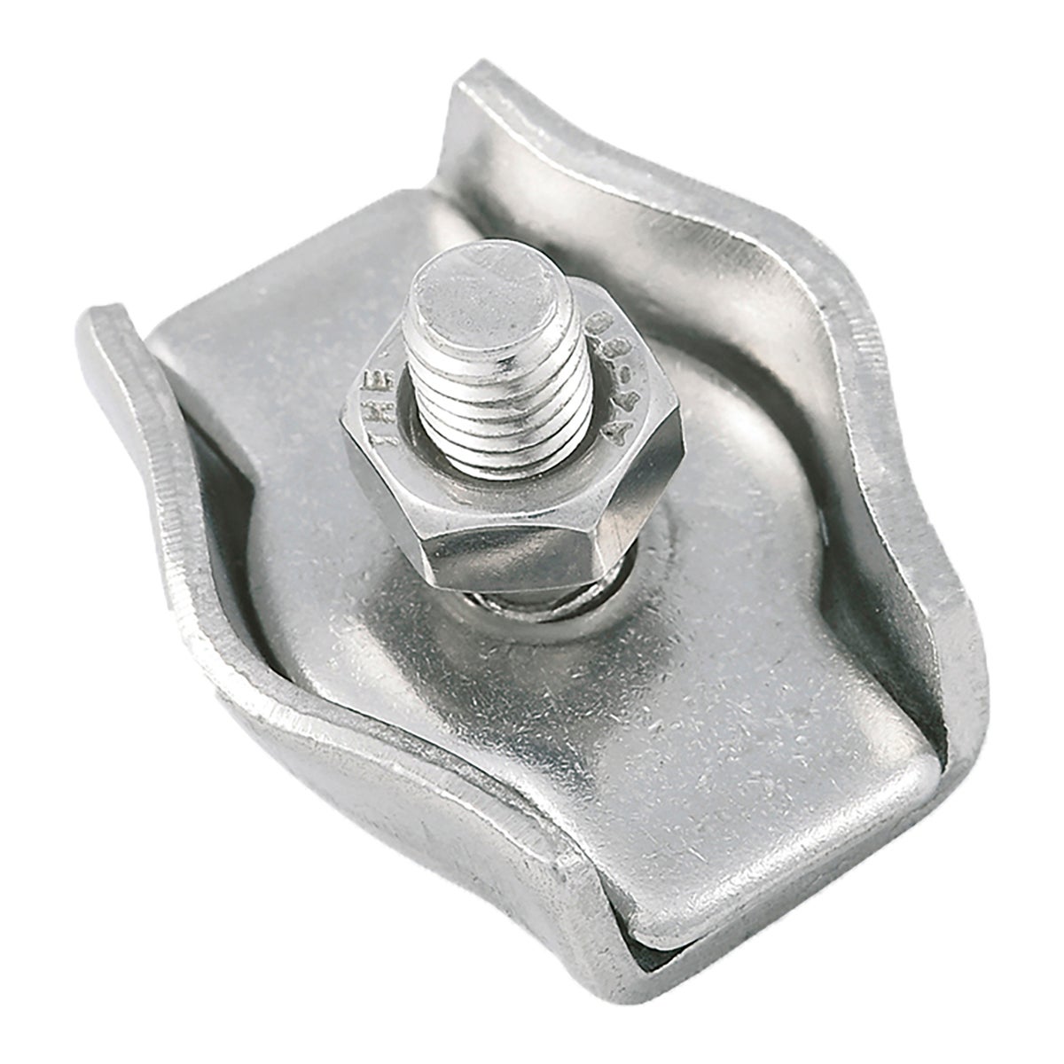 4 morsetti Simplex Ø 2 mm. in acciaio Inox A4 - AISI 316. Per il serraggio di cavi e funi, filetto metrico M4. Per bloccaggio funi e cavi fino a diametro 2 mm. Ad ingombro ridotto, per creare asole su funi e cavi in acciaio. Si sconsiglia l'utilizzo per carichi gravosi o su funi tessili. Non adatti per arrampicata o sollevamento