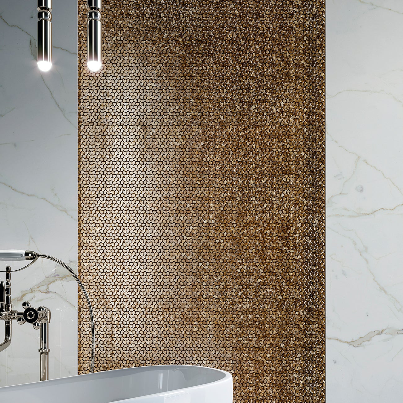 In alluminio e vetro. Ideale per posa a parete in ambienti interni alla casa, ma ottimo anche per creare listelli e/o inserti decorativi perché facile da tagliare. Si adatta a tutte le superfici sia dritte che ondulate. Mosaico ideale per la decorazione da interno, con effetto tenuamente metallizzato che crea un mutevole e gradevole gioco di luce e colori.. Particolarmente indicato per essere posato come rivestimento da interno, anche pareti doccia in abbinato a piastrelle, usando compensatori di spessore