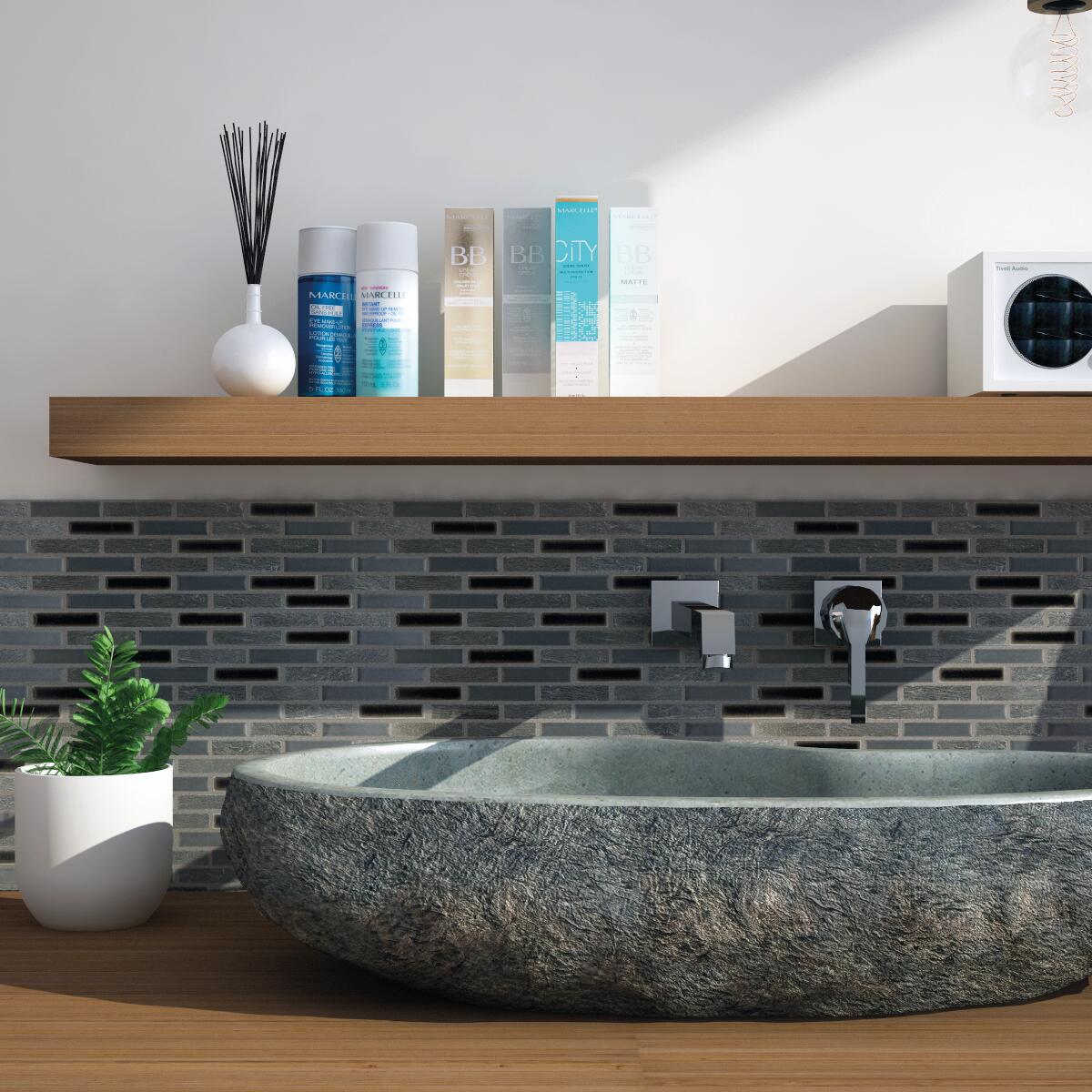 In pietra. Ideale per posa a parete in ambienti interni alla casa, ma ottimo anche per creare listelli e/o inserti decorativi perché facile da tagliare. Si adatta a tutte le superfici sia dritte che ondulate. Mosaico ideale per la decorazione da interno, con effetto tenuamente metallizzato che crea un mutevole e gradevole gioco di luce e colori.. Lo spessore 8 mm è particolarmente indicato per essere posato in abbinamento con la maggior parte delle piastrelle