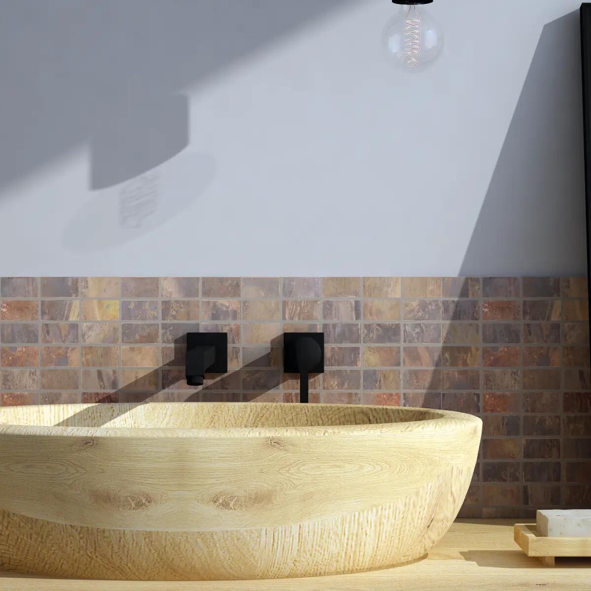 In metallo. Ideale per posa a parete in ambienti interni alla casa, ma ottimo anche per creare listelli e/o inserti decorativi perché facile da tagliare. Si adatta a tutte le superfici sia dritte che ondulate. Mosaico ideale per la decorazione da interno, con effetto tenuamente metallizzato che crea un mutevole e gradevole gioco di luce e colori.. Lo spessore 8 mm è particolarmente indicato per essere posato in abbinamento con la maggior parte delle piastrelle