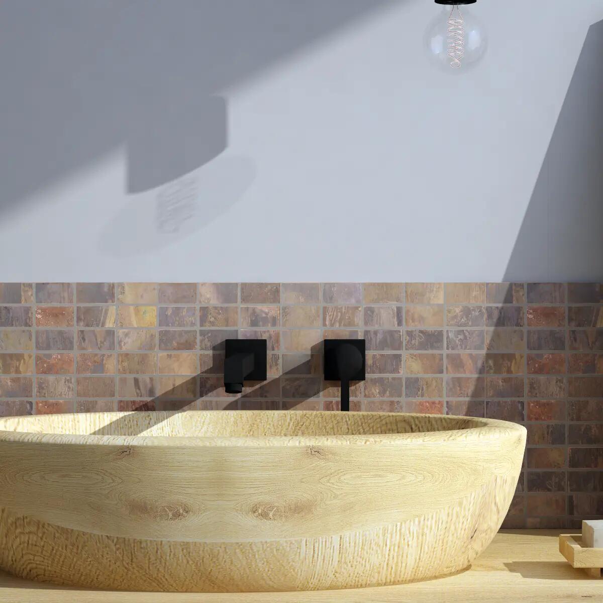 In metallo. Ideale per posa a parete in ambienti interni alla casa, ma ottimo anche per creare listelli e/o inserti decorativi perché facile da tagliare. Si adatta a tutte le superfici sia dritte che ondulate. Mosaico ideale per la decorazione da interno, con effetto tenuamente metallizzato che crea un mutevole e gradevole gioco di luce e colori.. Lo spessore 8 mm è particolarmente indicato per essere posato in abbinamento con la maggior parte delle piastrelle