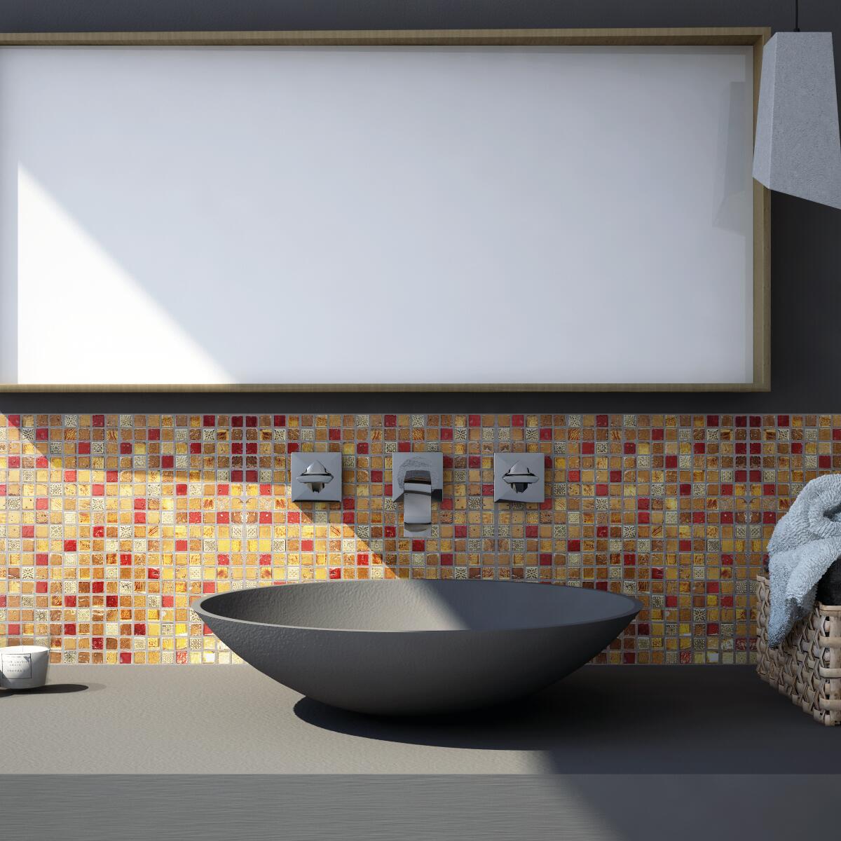 In pietra. Ideale per posa a parete in ambienti interni alla casa, ma ottimo anche per creare listelli e/o inserti decorativi perché facile da tagliare. Si adatta a tutte le superfici sia dritte che ondulate. Mosaico ideale per la decorazione da interno, con effetto tenuamente metallizzato che crea un mutevole e gradevole gioco di luce e colori.. Lo spessore 8 mm è particolarmente indicato per essere posato in abbinamento con la maggior parte delle piastrelle