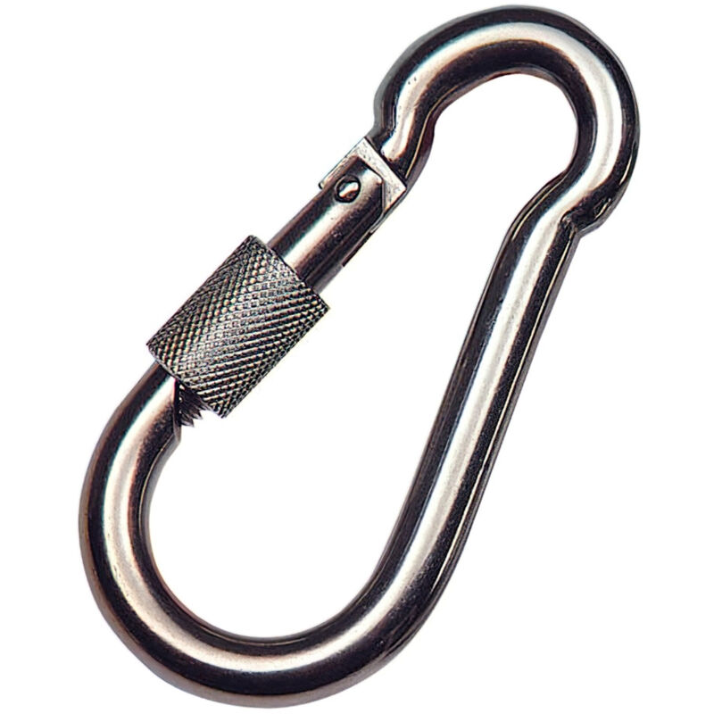 Moschettone Pompiere In Acciaio Inossidabile Con Sicurezza - Misura: 80 x 8 mm. - Realizzato in acciaio inossidabile. - Con anello di sicurezza. - Uso domestico - No Deve essere utilizzato in attività professionali come il trascinamento o il fissaggio di carichi.