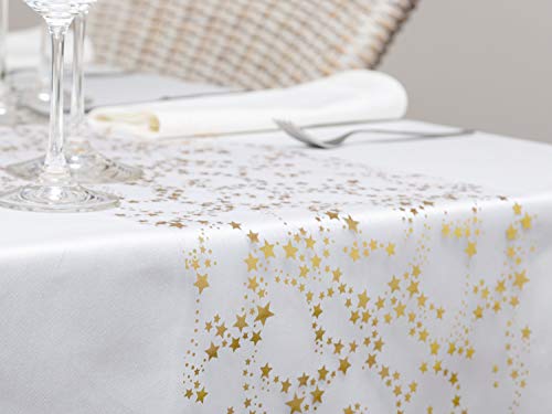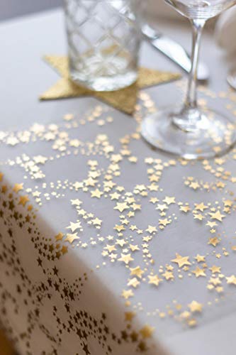 Contenuto: 1 x Runner da Tavola Stelle Oro/Metallizzato (28 cm x 5 m), in tessuto di Organza bianco trasparente con decorazione a Stelle in oro-metallizzato da 100%Mosel