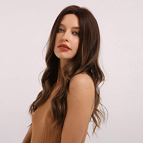 Mostfar Parrucca sintetica ondulata lunga marrone scuro Parrucche lunghe termoresistenti con taglio centrale per donne bianche 23.6In
