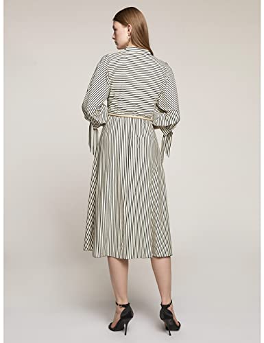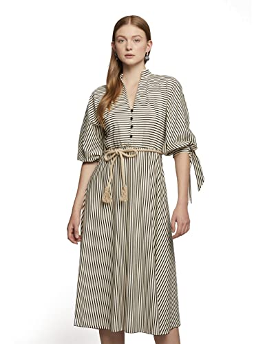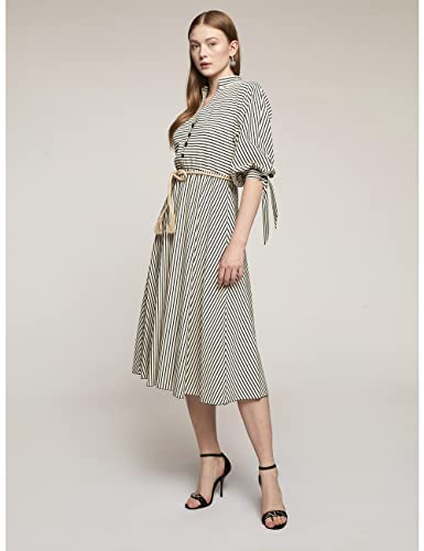 Vestito in jersey misto cotone a righe, modello con maniche a kimono lunghezza tre quarti con nastri da annodare al fondo, apertura frontale con scollo a v e collo a listino, bottoni foderati anteriori