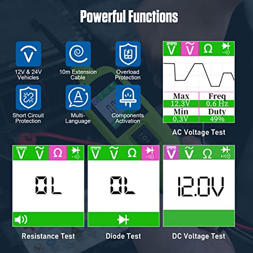 [Funzione principale] - Questo kit tester di circuito è una versione migliorata che esegue tutti i tipi di test, come tensione CC, tensione CA, frequenza del segnale, ciclo di lavoro, iniezione di carburante, resistenza, diodo, ecc. Può funzionare su tutti i 6-30 V impianti elettrici dei veicoli.