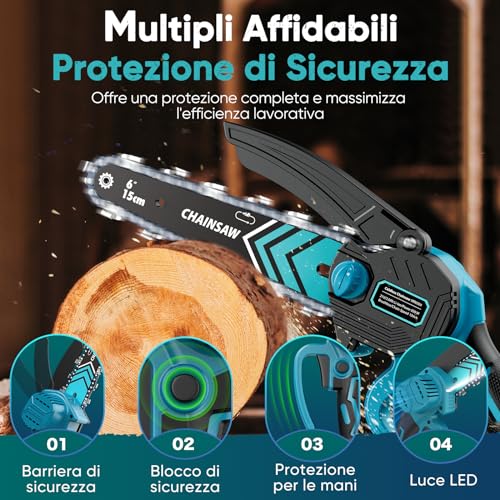 Mini Motosega a Batteria 8000mAh, 6 Pollici Portatile Sega a Batteria, Pompetta Olio, Ricarica Rapida e 2 Batterie da 4000 mAh, Blocco di Sicurezza, Adatto per Cesoie da Giardino, e Taglio Del Legno