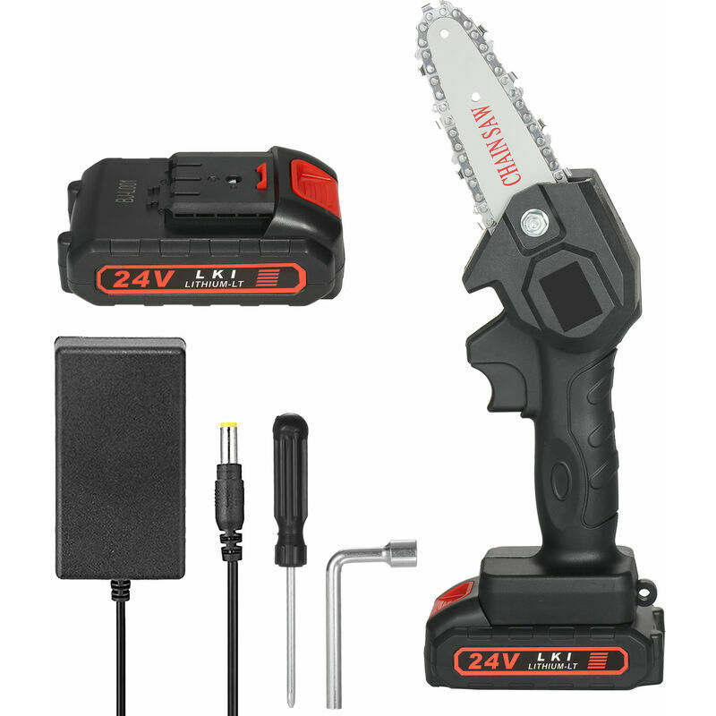 Caratteristiche: Taglio altamente efficiente - Catena in lega di alta qualità importata, resistente all'usura e durevole, taglio rapido e regolare con velocità di taglio 1/3 più veloce rispetto alle normali motoseghe, che possono tagliare un tronco di 15 cm/5,91 pollici (circa) in 10 secondi senza danni alla corteccia. Strong Dynamic System - La motosega a batteria da 24 V adotta tutto il motore in rame che non può fornire una forte perdita di potenza per rendere l'efficienza di taglio più alta e più veloce. La batteria al litio di grande capacità può fornire energia sufficiente, continue esigenze di lavoro all'aperto. Funzionamento con una sola mano - Questa mini sega da potatura con una lunghezza totale di 33 cm (13 pollici) e un peso di soli 1,5 libbre, ideale per il funzionamento con una sola mano e adatta per lavori continui di lunga durata senza fatica. Facilità di montaggio e minori esigenze di manutenzione - L'intera motosega è stata installata in pochi secondi, tutti gli