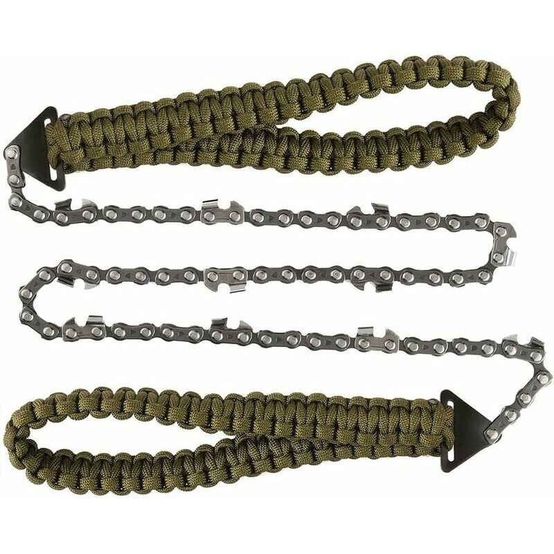 Motosega portatile Paracord con versatile da maneggiare: sega da campo molto leggera, versatile e flessibile.perfetta per escursioni, campeggio, emergenze, lavori in giardino e semplici qu Riduzione della velocità e risparmi molto più nitidi: con undici palmari lame per sega, la Survival Saw può tagliare il legno da piccoli rami a grandi tronchi d'albero in pochi secondi e taglia facilmente i rami sopraelevati, legature costanti ma flessibili flessibili per creare un movimento bidirezionale, che consente di risparmiare molto tempo e fatica. Materiale più durevole e più resistente: acciaio selvaggio di grado industriale per la lavorazione Catena termica a lungo termine durata super forte, con manici in paracord autopulenti e denti ritagliati. . viene fornito con una bustina per riporre i passanti della cintura contro la motosega. è fantastico da mettere in tasca, in borsa o aspettare la cintura. Il regalo perfetto per un mulpitle universale Usi ideali: sega a mano per diverse