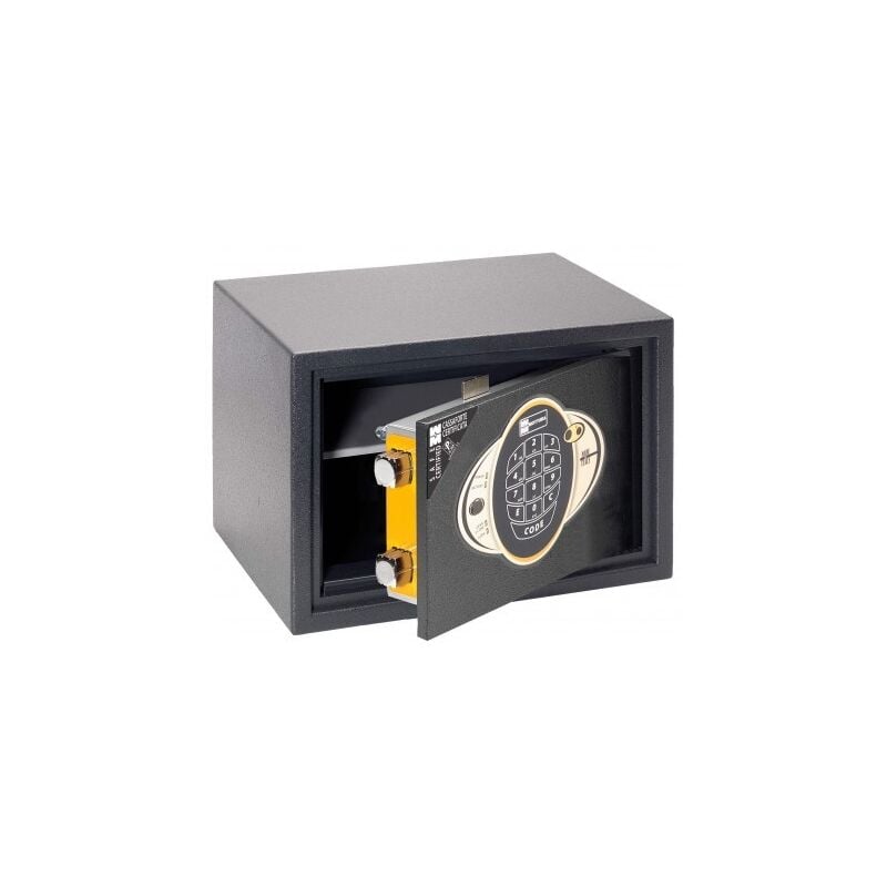 Modello da appoggio in versione con Combinazione elettronica a tastiera Protezione al manganese estesa ai chiavistelli frontali Il movimento dei chiavistelli SAGOMATI è motorizzato Questa serie di casseforti, non richiedendo interventi di muratura, risolve comodamente tutti i problemi di installazione, grazie alla predisposizione per un duplice ancoraggio alla parete e al pavimento (tasselli forniti). Tre strati di acciaio avvolgono interamente la cassaforte Spessore portello mm 10;