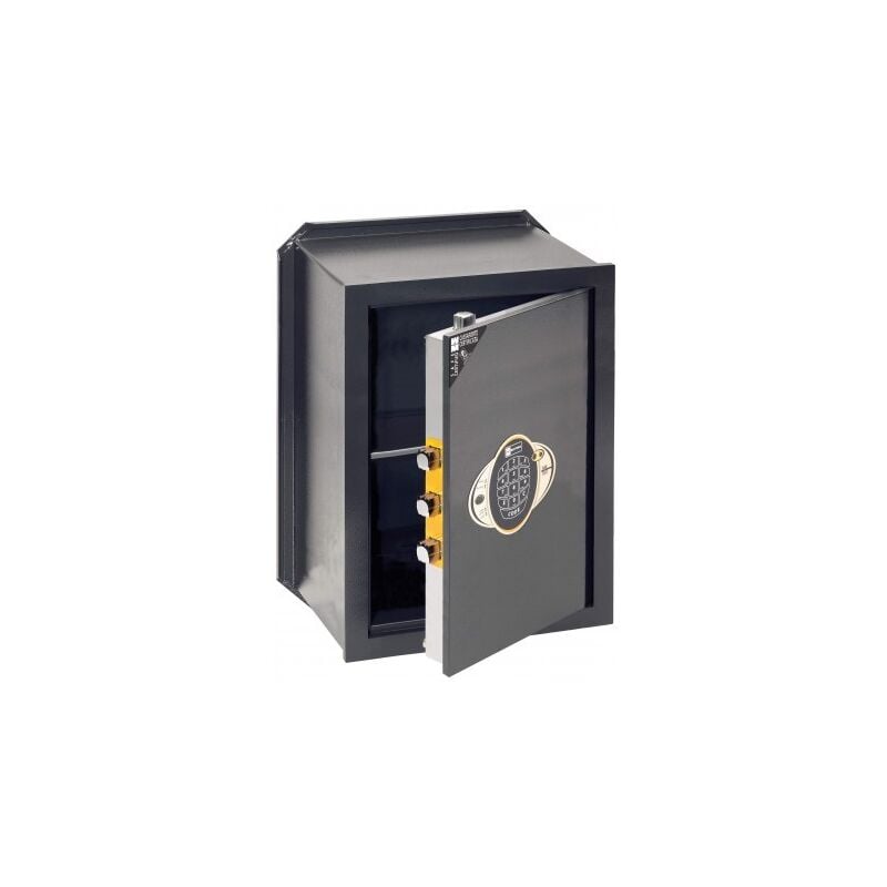 Modello ad incasso con chiusura a combinazione elettronica CASSAFORTE CERTIFICATA SECONDO NORMA UNI EN 14450, GRADO S2, DA ICIM La tastiera caratterizza tutti i modelli delle casseforti elettroniche Mottura CERTIFICATE al massimo livello della norma UNI EN 14450 L' elettronica è di nuova realizzazione rispetto ai modelli precedenti. Il movimento dei chiavistelli SAGOMATI è motorizzato Protezione al manganese estesa ai chiavistelli frontali Una luce interna a led si accende automaticamente a cassaforte aperta 1 ripiano interno in dotazione Spessore portello mm 10;
