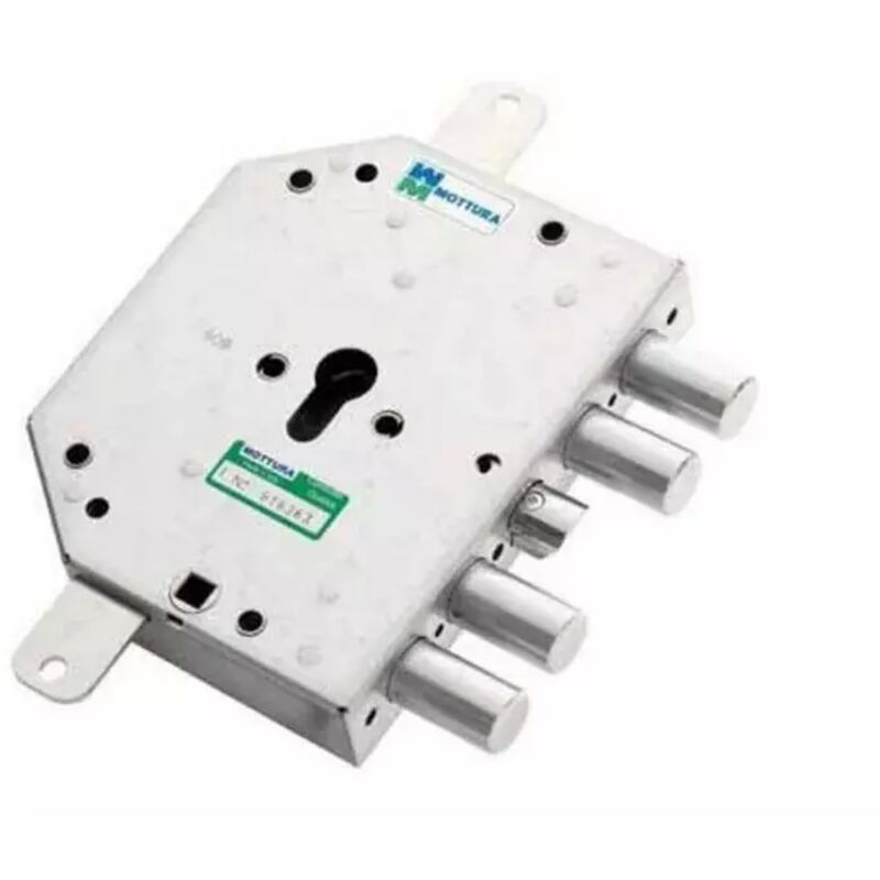 Serratura di sicurezza applicata per porte blindate CR 89C855T DESTRA predisposta per cilindro europeo e mezzo giro comandato da quadro maniglia e da chiave. Chiusura triplice: 1 punto di chiusura composto da 4 chiavistelli con escursione di 29 mm e mezzo scatto, 1 punto di chiusura verso l'alto e 1 verso il basso entrambi con aste. Corsa aste 14 mm. Dimensioni scatola largh.132 mm. alt.165 spess.30,5 mm. Entrata chiave mm.60,5. La serratura viene fissata tramite 4 boccole. Fissaggio cilindro con VITE DI TESTA . Finitura: zincata. Sistema anti-intrusione: bloccaggio nel caso di estrazione del cilindro. Info: la mano della serratura viene stabilita guardando lo schema nelle foto (la fotografia principale si riferisce alla versione DESTRA). ATTENZIONE: le aste e gli accessori non sono compresi.