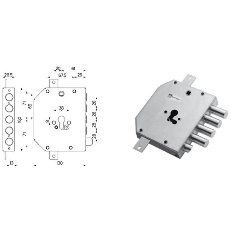 Serratura per blindata Entrata chiave 61 mm Entrata maniglia 61 mm Movimento triplice Interasse catenacci 37 mm Numero catenacci 3 Scrocco (mezzogiro) SX (sinistra) Maggiorazione catenacci +0 Maggiorazione scrocco +0 Chiave cilindro europeo Dimensioni cassa serratura 130x160 mm Ricambio per MEGABLOCK