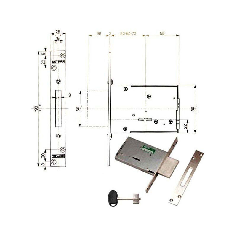 Serratura zincata infilare ferro Catenaccio acciaio zincato Doppia mappa 4 mandate Ambidestra Scatola 80 - Frontale 25x190 Dotazione 3 chiavi