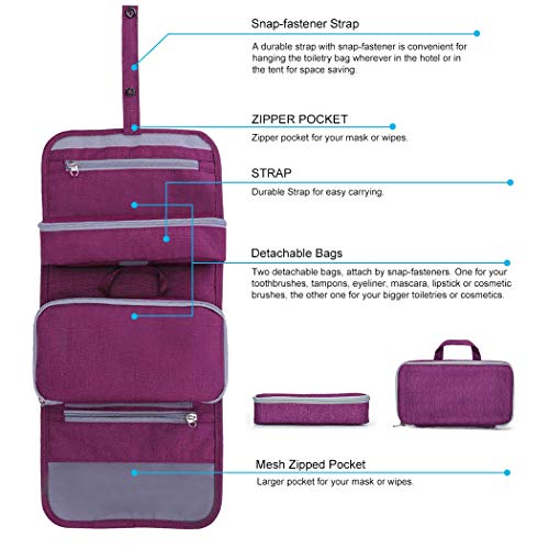 Design ultra pratico da appendere: la borsa per cosmetici ha una cinghia con bottoni a pressione. Se si arrotola la borsa viene utilizzata per fissare la posizione per risparmiare spazio. D'altro canto, la sospensione avviene tramite bottoni a pressione che sono molto resistenti e durevoli quando si utilizza in un hotel o in una tenda.