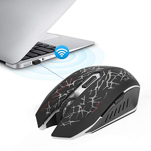 MOUSE DI GIOCO WIRELESS RICARICABILE : Il mouse wireless a 6 tasti da 2,4 GHz adotta una batteria al litio ricaricabile da 400 mA 18650, una trasmissione di 10 metri ed è dotato di un interruttore di alimentazione principale. Interfaccia di ricarica Android, la ricarica è semplice e conveniente.