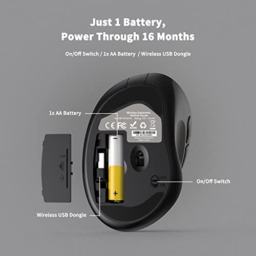 Lunga durata della batteria: richiede solo una batteria AA (non inclusa), grazie alla modalità di risparmio energetico automatico e all'interruttore on/off, il mouse verticale può funzionare fino a 12 mesi. Nota: la durata della batteria può variare in base alle condizioni di utilizzo e calcolo.