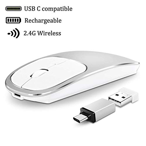 Mouse wireless portatile USB di tipo C wireless ricaricabile 2,4 GHZ mouse wireless portatile sottile e silenzioso clic per computer Windows 7/8/10/Vista/XP/MacBook, mouse 1600 dpi, risparmio energetico (argento)