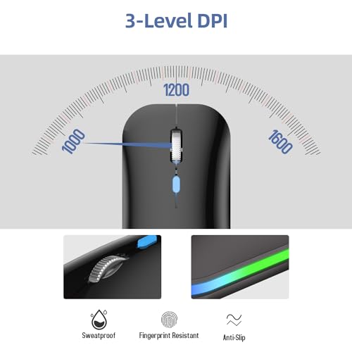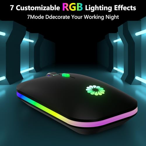 Mouse wireless ricaricabile a LED con ricevitore USB, mouse wireless a 7 colori a 2,4 GHz, 1000-1600 DPI regolabile per Mac OS/Windows/Andriod/Microsoft (Nero)