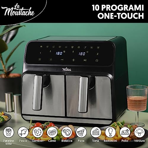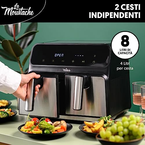 La Moustache - Friggitrice Senza Olio 8L ad Aria Calda 1700W con E-Book di Ricette, 2 Cestelli Separati, 10 Programmi, Timer, Griglie Antiaderenti, 3 in 1, Frigge/Griglia/Riscalda (DuoFry Gray)