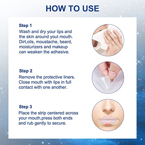 Facile da usare: Passaggio 1: lavare e asciugare le labbra e la pelle intorno alla bocca. Sporco, barba, trucco, ecc. indeboliranno l'adesivo. Passaggio 2: rimuovere il cuscinetto protettivo. Tocca completamente il cerotto anti-russamento con le labbra. Passaggio 3: posizionare il cerotto anti-russamento al centro della bocca, premere entrambe le estremità e strofinare leggermente per fissarlo.