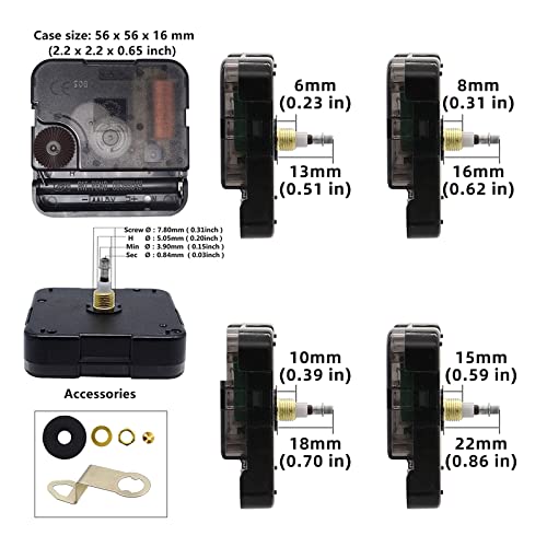 4 Dimensioni meccanismo orologio: primo albero lunghezza totale 13 mm (0,51 pollici), lunghezza filettatura 6 mm (0,23 pollici), adatto per pannello orologio spessore 2-3 mm. Seconda lunghezza totale sharft 16 mm (0,62 pollici), lunghezza filettatura 8 mm (0,31 pollici), adatto per pannello orologio di spessore 4 - 6 mm. Terza lunghezza totale sharft 18 mm (0,7 pollici), lunghezza filettatura 10 mm (0,39 pollici), adatto per pannello orologio di spessore 7-8 mm. Quarta lunghezza totale sharft 22 mm, lunghezza filettatura 15 mm, adatto per pannello orologio di spessore 9-12 mm.