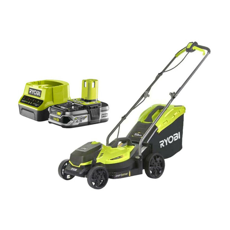 Presentazione: Pack RYOBI Push Mower 18V OnePlus OLM1833B - 1 batteria 2,5Ah - 1 caricatore rapido RC18120-125, Questo pacchetto comprende un tosaerba a spinta, una batteria da 2,5 Ah e un caricatore. La falciatrice è dotata di una regolazione centralizzata dell'altezza di taglio che rende facile e veloce il raggiungimento di un eccellente risultato di taglio. Vantaggi: CONCEPT ONE+: tosaerba alimentato da una batteria al Litio+ 18 V One+ compatibile con più di 40 attrezzi da giardinaggio e fai da te. IDEALE per prati fino a 250 m² (Questo modello è venduto senza batteria o caricabatterie - si consiglia una batteria da 5,0 Ah minimo per un'autonomia ottimale)) Montaggio/smontaggio senza attrezzi e facile da immagazzinare Le impugnature a doppio comando ergonomiche e regolabili in altezza di Vertebrae rendono ancora più facili le manovre e più comode da usare Regolazione centrale dell'altezza di taglio - permette di regolare in modo semplice e veloce l'altezza di taglio al risultato