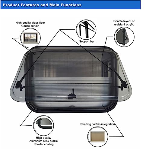 ✪ 【Materiale di alta qualità】: il telaio di questa finestra di ventilazione per roulotte è realizzato in lega di alluminio di alta qualità, che è durevole e ha una buona resistenza agli urti, e la finestra di vetro è realizzata in acrilico a doppio strato, che ha una buona protezione dai raggi UV e forte capacità di resistenza alla compressione. Ci sono varie specifiche tra cui scegliere.