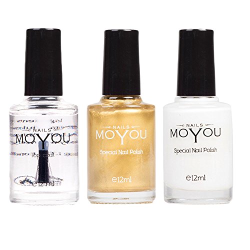 MoYou Nails Bundle of 3 Stamping Nail Polish: Top Coat, Bianco e Oro Colori utilizzato dai professionisti del Settore Nail per ottenere decorazioni belle e alla moda provenienti direttamente dal distributore