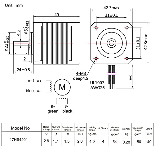 Motore Stepper - NEMA 17 modello, motore stampante 3D con 40 Ncm (56,6 oz.in) ad alta tenuta.
