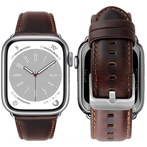 MroTech Cinturino di ricambio per iWatch Series 7 6 SE 5 4, 44 mm, 45 mm, compatibile con iWatch Series 7 6 SE 5 4 mm, in vera pelle, colore caffè e argento, 44 mm