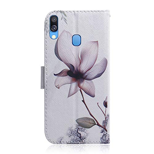 MRSTER Cover per Samsung Galaxy A40, Moda Bello Custodia a Libro in Pelle PU Flip Portafoglio Custodia Shockproof Resistente Case per Samsung Galaxy A40. EF PU- White Lotus