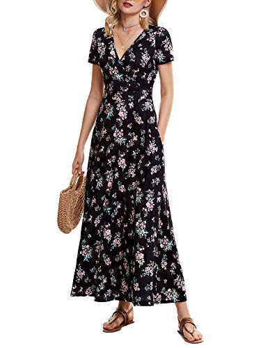 MSBASIC Vestito estivo lungo da donna, abito da spiaggia, con tasche, abito avvolgente, scollo a V, abito da festa, abito a maniche corte, per ospiti di nozze, rose, S