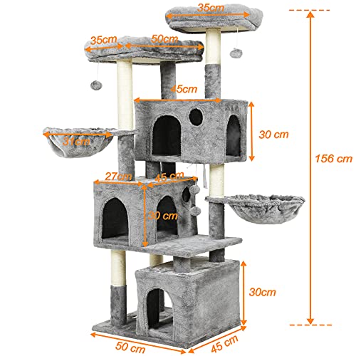 MSmask - Albero tiragraffi per gatti, con 2 piattaforme e 3 tane, albero da arrampicata stabile (156 cm, grigio chiaro)