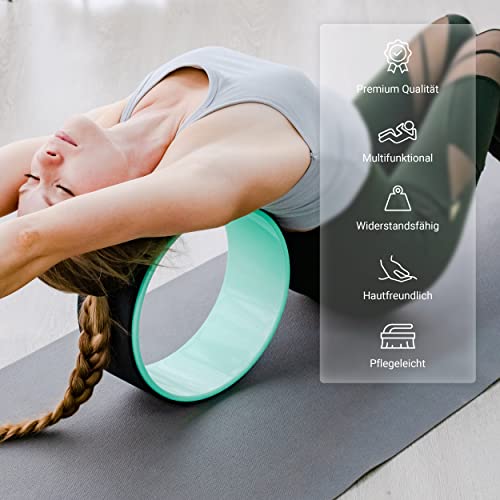 Strumento per lo yoga: con la ruota da yoga si possono modificare gli esercizi di yoga e completare l'allenamento yoga con molti nuovi esercizi. I principianti possono toccare lentamente le posizioni più difficili, come ad esempio il rimbalzo. Gli appassionati di yoga avanzati possono utilizzare una ruota yoga per approfondire le singole posizioni e eseguire con una maggiore precisione.