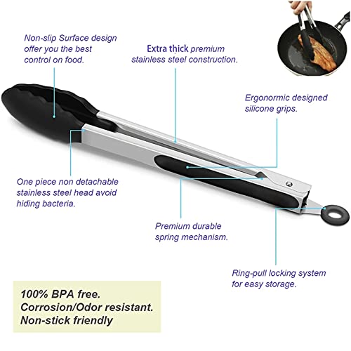 Mtskaeo Pinze da cucina professionali, pinze per barbecue, pinze da cucina in acciaio inox e silicone antiscivolo, termiche, utensili da cucina per cucinare, servire e grigliare, 7inch - nero..