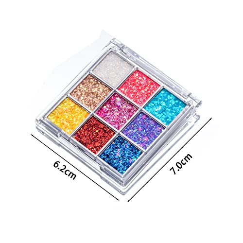 Palette di Ombretti Scintillanti: Una palette di ombretti glitter pressati con 9 colori abbaglianti, disponibile in 3 tonalità di stile con palette di glitter diamantati per soddisfare le tue esigenze. Creare fantastici effetti di trucco per i tuoi occhi o il tuo corpo.