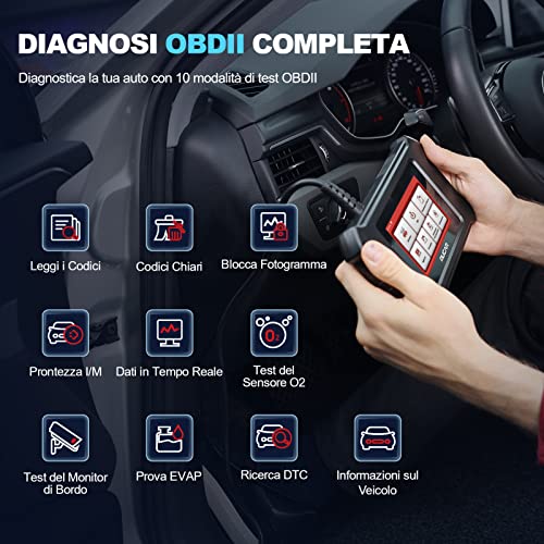 [Servizi di funzione OBD2 completi in 10 modalità]➤Questo scanner diagnostico supporta 10 modalità di funzioni OBD2 per mostrare il flusso di dati in tempo reale 4 in 1 (come dati di flusso PCM, velocità del motore), test del monitor di bordo (modalità 6), test EVAP (modalità 8), disponibilità I/M ecc. ➤Con i dati del fermo immagine è possibile controllare l'assetto del carburante del veicolo, la temperatura del liquido di raffreddamento del motore e altro.
