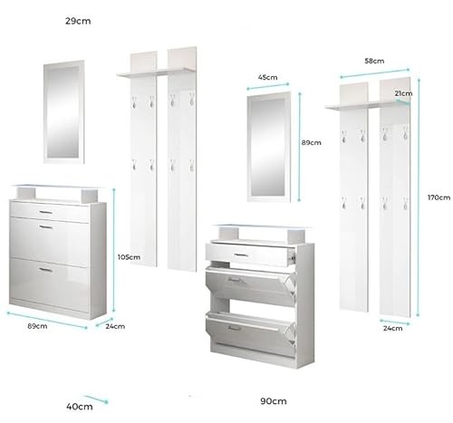 Include: Mobile da ingresso, specchio, attaccapanni, luce LED blu, maniglie in metallo, viti e istruzioni per un facile montaggio (non sono necessari attrezzi speciali).
