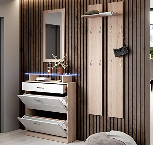 MB Muebles Bonitos | Set da ingresso con Scarpiera, Specchio e Attaccapanni | Mobile da ingresso moderno | Ripiano in vetro e luce LED | Colore Bianco e Sonoma | Modello Paola Set