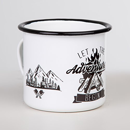 Mugsy - Tazza smaltata con scritta “The Adventure Begins”, 300 ml, attrezzatura da campeggio, design retrò (bianco)